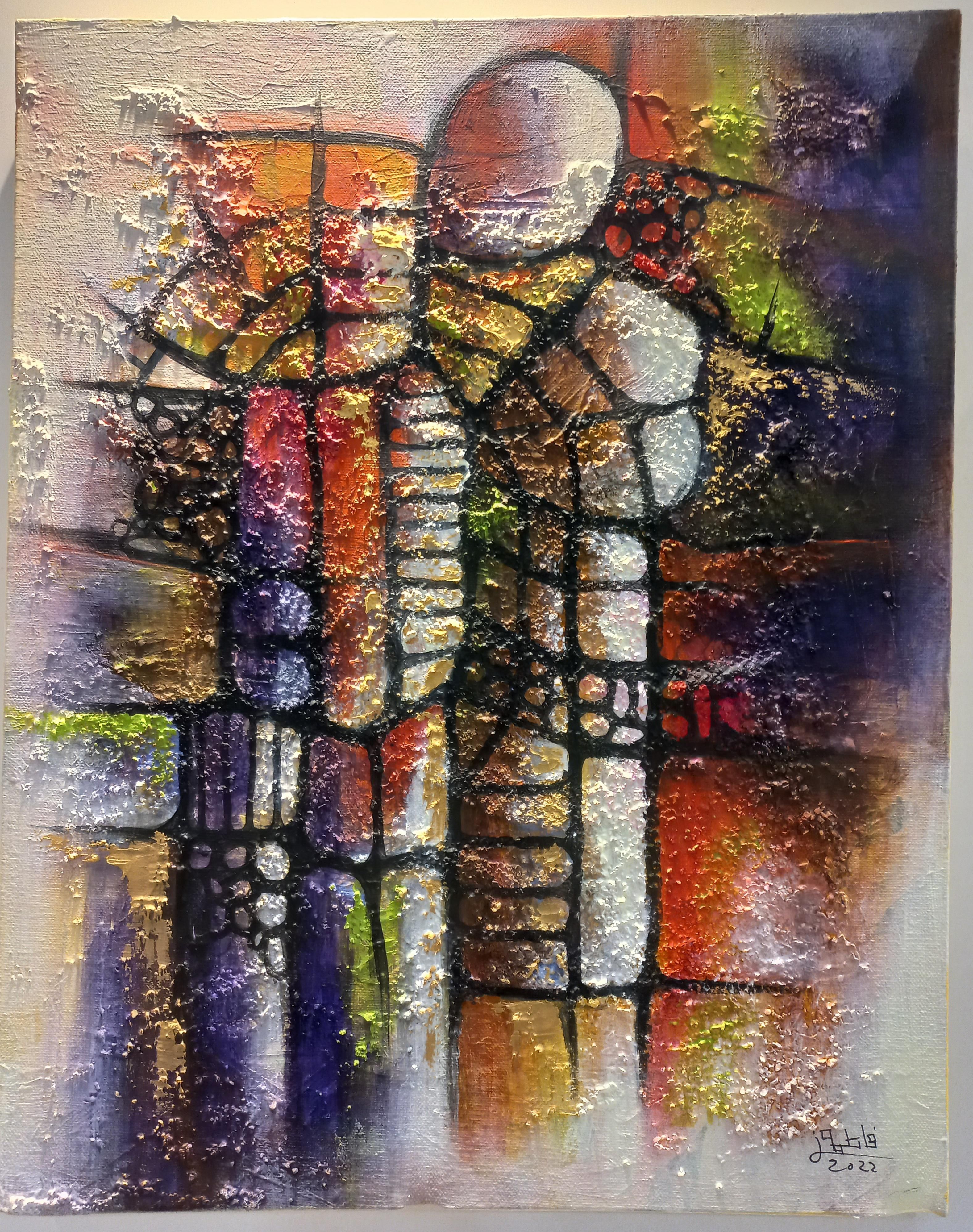 لوحة تجريدية معبّرة تجسّد مفهوم التلاحم والتراحم في حياة الإنسان، حيث تتشابك الألوان والخطوط السوداء لتصنع تكوينًا بصريًا يوحي بالترابط والقوة الداخلية. تتداخل درجات البرتقالي والأحمر والبنفسجي مع ومضات من الأبيض والذهبي، مما يمنح العمل عمقًا روحانيًا وإحساسًا بالدفء